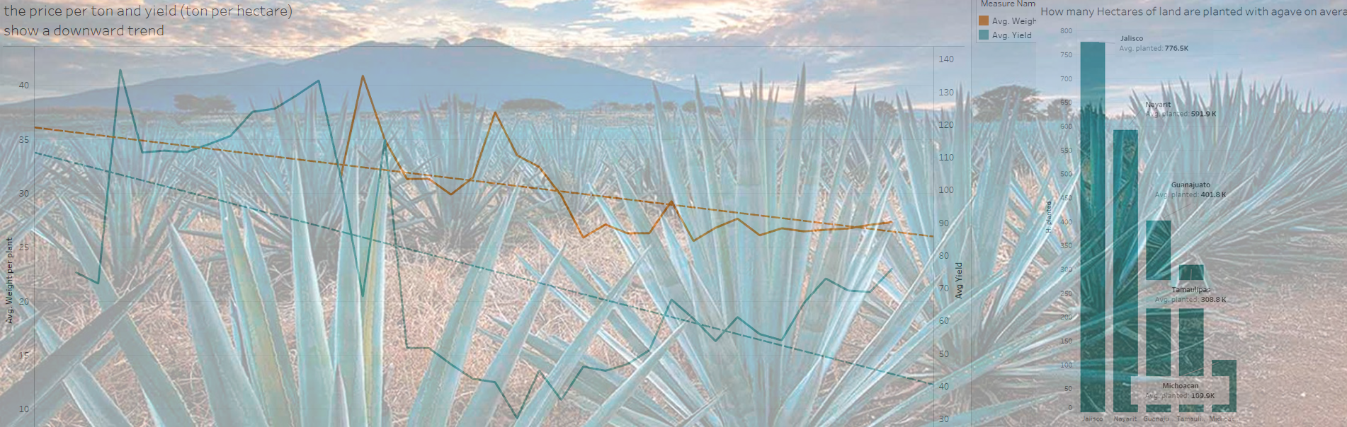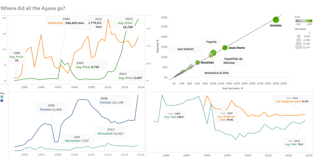 Following the growth of popularity of Tequila, prices per ton of agave keep going up and years with harvest deficit keep happening. Farmers have difficulties meeting the demand for Agave despite an increase in the hectares planted with it. This difficulty can be attributed to an average lower yield and a lower average weight per plant of Agave, but mainly to the huge losses of hectares planted with agave. The following sections will explore the farming practices of Agave Tequilana Weber from 1986 to 2023 and highlight avenues for improvement in Agave production.