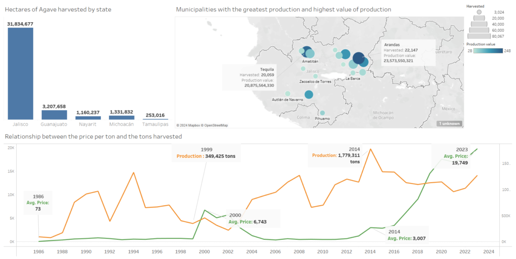 - Price and harvest: Evaluation of historical harvest patterns in Jalisco, Guanajuato and the relationship between the number of hectares harvested and the price per ton of Agave in Jalisco.