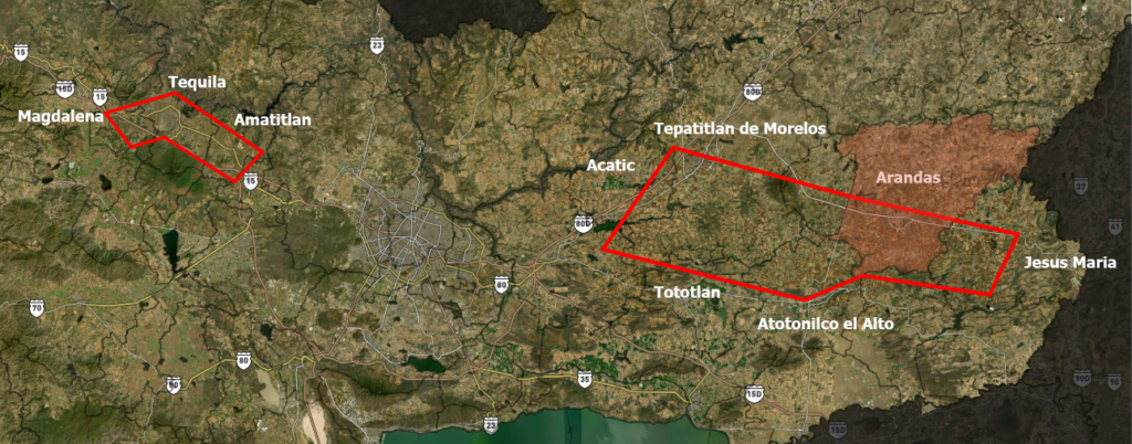 - The municipalities where most Agave is produced in Jalisco are located at the North-East and North of the state. Arandas has harvested 22,147 Hectares, Tequila 20,059, Jesus Maria 15,360, Tepatitlan 15,057. The production value for these municipalities is 23.5 billion (23.5 thousand millions) for Arandas, 20.8B for Tequila, 15.5B for Jesus Maria and 14.4B for Tepatitlan.