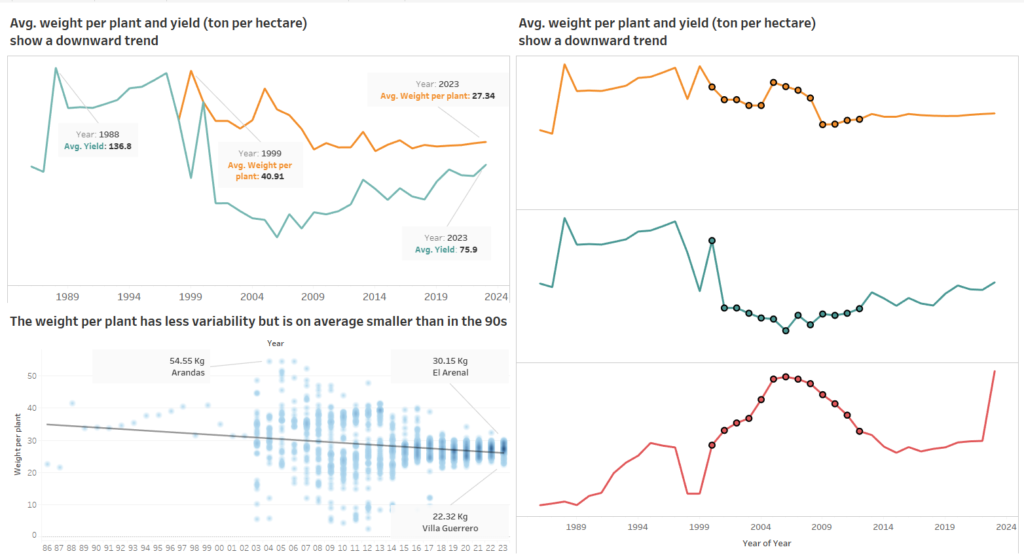The average weight per plant has decreased by 15 Kg since 1999, stabilizing at a little over 25Kg per plant since 2014. - The avg. weight per plant and the avg. yield are directly related except for the years where the loss of hectares was the greatest. Between 2000 and 2012 there was a significant increase in the lost hectares planted with agave and those years both the avg. yield and the avg. weight per plant become erratic.