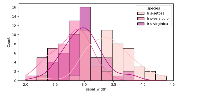 sns.histplot(data=df,x='sepal_width', kde=True, hue='species', palette='RdPu')