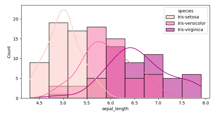 sns.histplot(data=df,x='sepal_length', kde=True, hue='species', palette='RdPu')