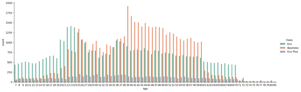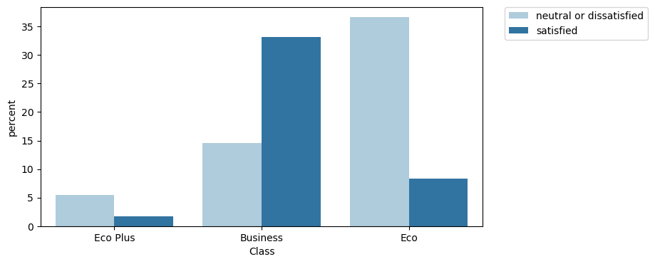 - 48% fly Business class, 45% of passengers fly Economy and 7% fly Economy Plus. Business Class Customers are noticeably more satisfied than Economy and Economy Plus Customers