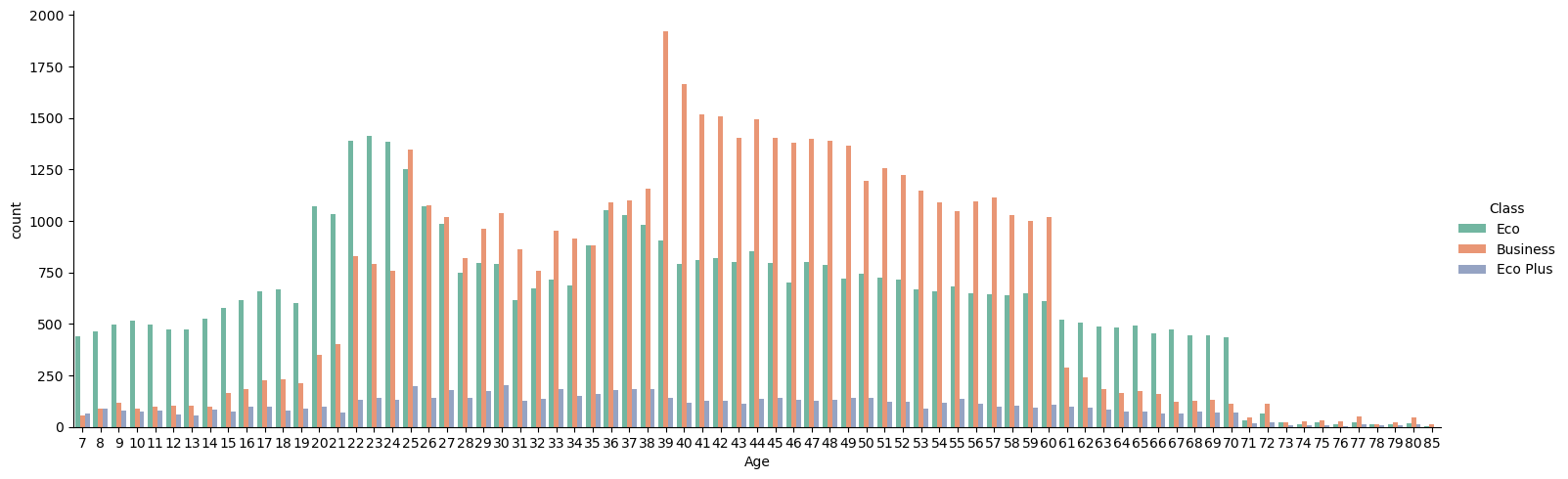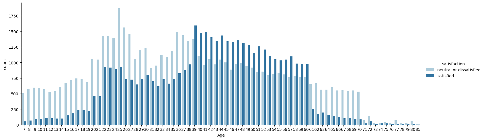 - Ages of the passenger range between 7 and 86 years old. The average age of the passengers is 39 years. The most satisfied customers are between the ages of 39 and 60, also the passengers who most commonly travel in Business.