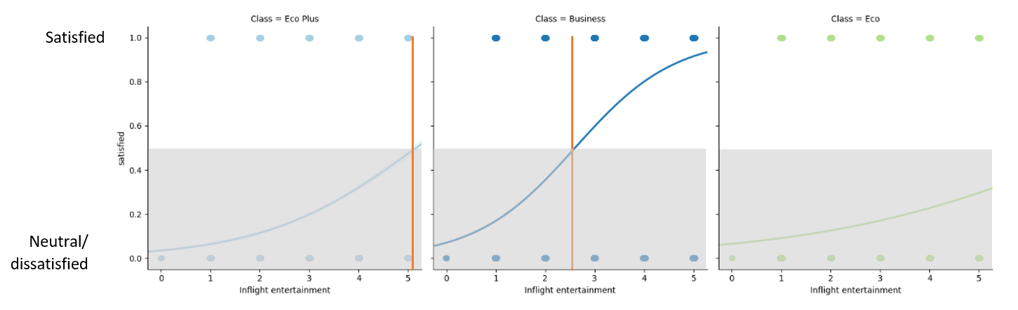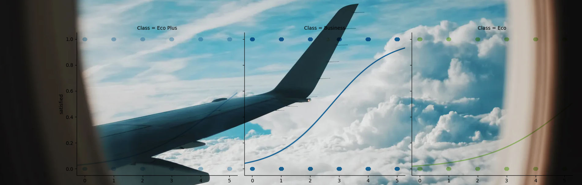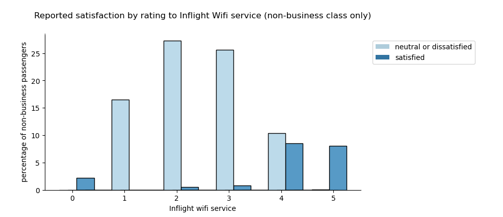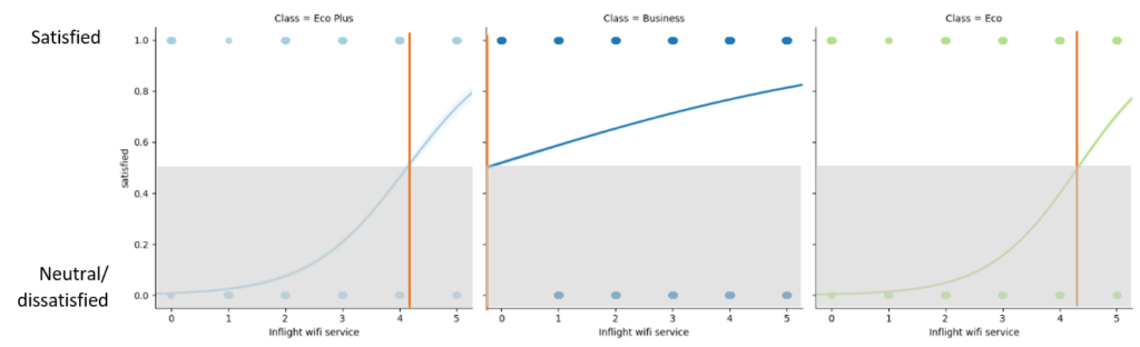 - Eco and Eco Plus passengers are more likely to report satisfaction when they rate the Wifi service higher than a 4. Business passengers are likely to report being satisfied independent of their rating to the Wifi service.