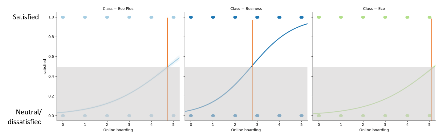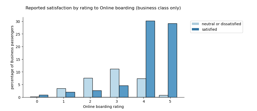 - Business passengers are more likely to report being satisfied when they rate Online boarding at 3 or higher. Eco plus at 5, and Economy passengers are unlikely to report being satisfied even when they rate it at 5