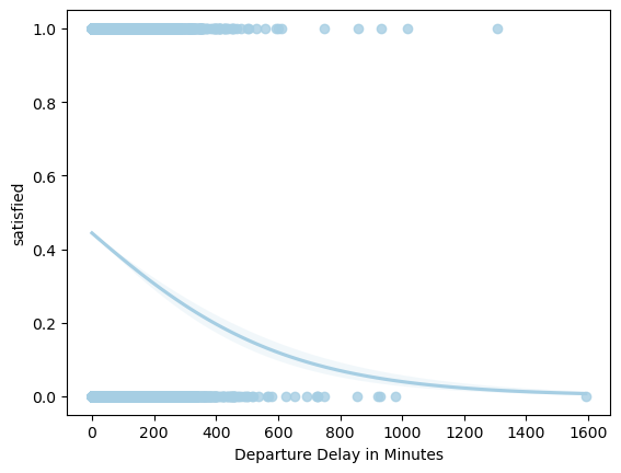 - Passengers are equally likely to be satisfied or dissatisfied when the delay is less than 6 min, but less likely to be satisfied after that.
