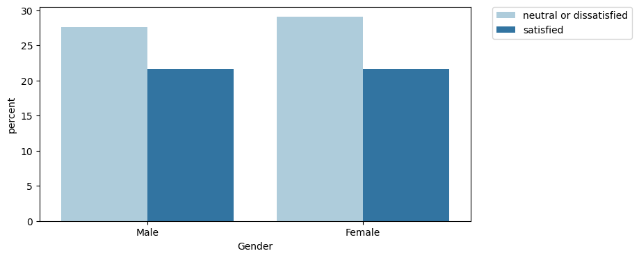 - Gender is evenly split between female and male. Neutral or dissatisfied responses were more common for both groups.