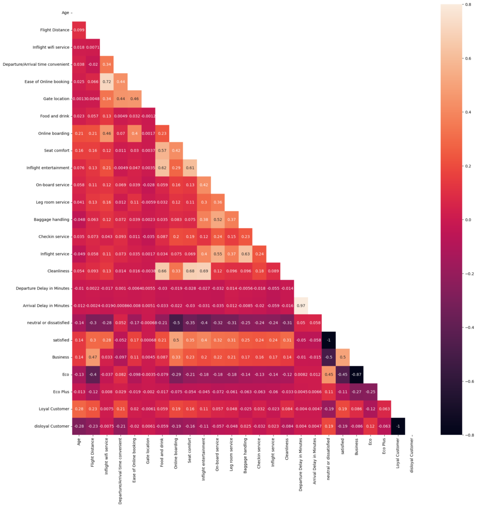 - Online boarding, inflight entertainment and seat comfort were the metrics with the highest correlation to a client reporting being satisfied. Flight delay, gender and type of customer showed little to no correlation with satisfaction (under 0.2)