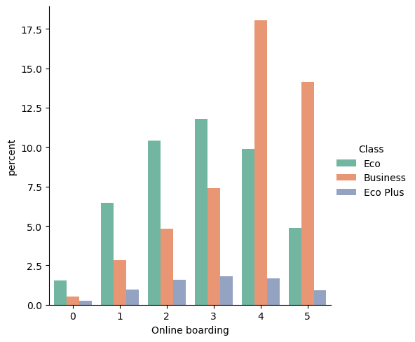 - Economy class and Eco Plus passengers rated the Online Boarding mostly as a 3 out of 5, while Business Class passengers mostly rated it as a 4 out of 5.