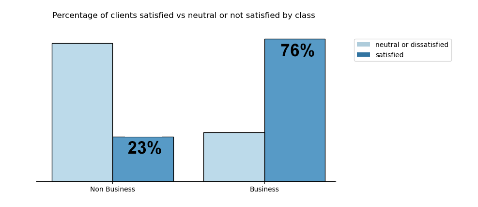 while only 23% of Economy and Economy Plus report satisfaction.
